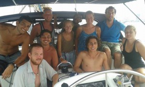 We met with the captain, Fabian, the day before our departure and several things were discussed like safety at sea and how toilets on sailing ships work. We met the next day in the evening and brought our bags over to the ship before dinner. The bicycle was tied to the railings and was dangling rather adventurously over the water. But Carmelo, the ayudante and cook on the ship, tied it with a thick rope on frame and wheels and my mind was put at ease. It took a little longer to get out of the harbour and we could get some sleep while still in calm waters. The rocking and rolling started early the next morning and i wasn’t feeling too well when i got up and skipped breakfast and was just nibbling on some dry toast. Throughout the day i felt tired and spent most of the time lying around until we reached the first of the San Blas Islands. Little dots of sand with only some palm trees and huts on them, they make for a beautiful stop-over to Cartagena.Ssurrounded by coral reefs, half of its beauty lies under water which we thoroughly explored. Here’s a shot of the group.