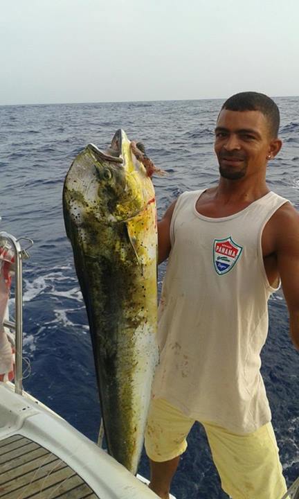 Snorkeling made half of the day’s activity, which stayed interesting, as we maneuvered each day to another island where wrecks of an old freighter and also of a sailing ship, that was set against the reef by a drunk captain, were lying just meters below the surface. The last day in San Blas was spent on an island with only a bar and a soccer field on it. After dinner we set sail for Cartagena. There was nothing much happening during the fifty hours of the crossing.One highlight was when ayudante Carmelo caught this fish.